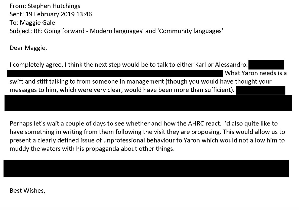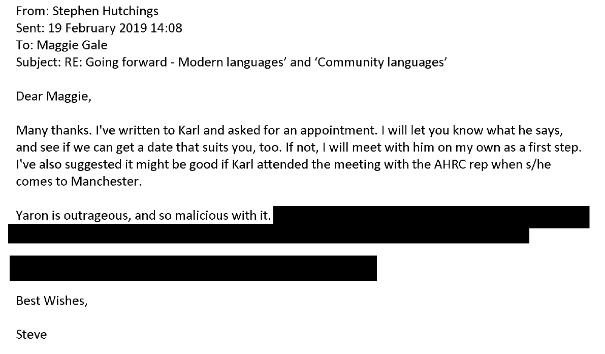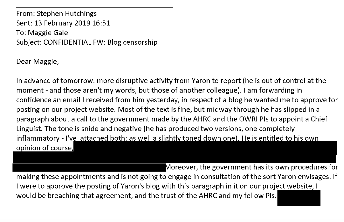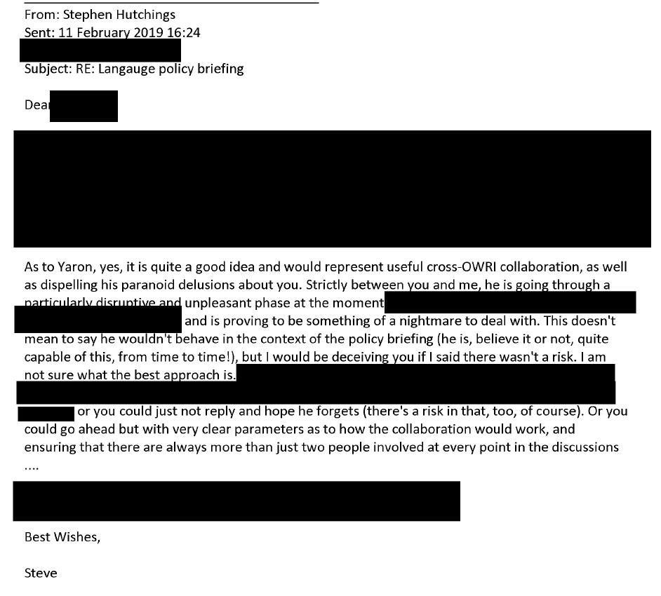 When I expressed scepticism around the Chief Linguist initiative, asking for evidence that a similar position had brought about results in other settings and questioning the proposal to accommodate it with the security services rather than in the domain of culture, communities, education or even in an overarching inter-ministerial department, I was declared to be the enemy from within, the OWRI scheme’s Emmanuel Goldstein. For starters, I was banned from participating at the Westminster event at which the proposal was publicised. Hutchings then widened his campaign of personal defamation to discredit me and my intentions. He wrote to Maggie Gale, his successor as School Research Director, saying about me: “He conducts vendettas against anyone whom he considers a threat to his narcissistic view of the world”. He went on to write: “Yaron is outrageous and so malicious“, “he is out of control”, “he is mercurial and unpredictable”. He opened one of his messages with the words “more disruptive activity from Yaron to report” and communicated in another that it was important to “not allow him to muddy the waters with his propaganda”. He then described me as “cunning” because in a draft blog post which I had shared with him in confidence to obtain his feedback, I had “slipped in a paragraph about a call to the government to appoint a Chief Linguist. The tone is snide and negative. He is entitled to his own view, of course. [here three lines were redacted by the University of Manchester – I can only imagine what they contained]. If I were to approve the posting of Yaron’s blog with this paragraph I would be breaching the trust of the AHRC and my fellow PIs”. In response, I was instructed by Gale: “Stephen Hutchings has absolute editorial veto on any and all communications linked to the project and its works. You must not bring the university’s reputation into disrepute through communications which in fact reflect your own opinions”.