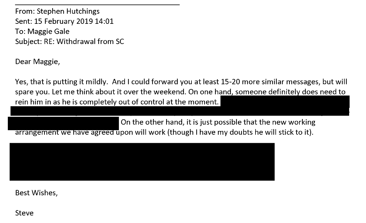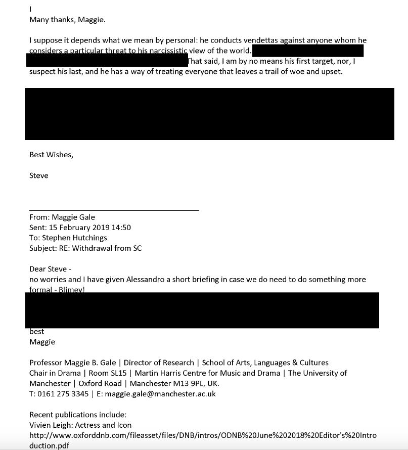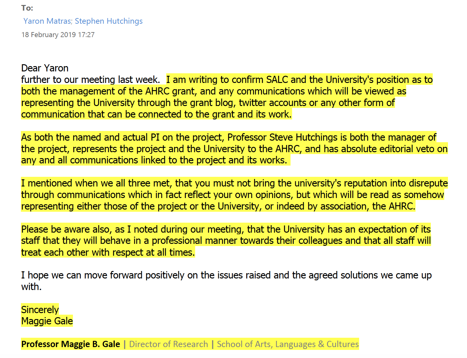 When I expressed scepticism around the Chief Linguist initiative, asking for evidence that a similar position had brought about results in other settings and questioning the proposal to accommodate it with the security services rather than in the domain of culture, communities, education or even in an overarching inter-ministerial department, I was declared to be the enemy from within, the OWRI scheme’s Emmanuel Goldstein. For starters, I was banned from participating at the Westminster event at which the proposal was publicised. Hutchings then widened his campaign of personal defamation to discredit me and my intentions. He wrote to Maggie Gale, his successor as School Research Director, saying about me: “He conducts vendettas against anyone whom he considers a threat to his narcissistic view of the world”. He went on to write: “Yaron is outrageous and so malicious“, “he is out of control”, “he is mercurial and unpredictable”. He opened one of his messages with the words “more disruptive activity from Yaron to report” and communicated in another that it was important to “not allow him to muddy the waters with his propaganda”. He then described me as “cunning” because in a draft blog post which I had shared with him in confidence to obtain his feedback, I had “slipped in a paragraph about a call to the government to appoint a Chief Linguist. The tone is snide and negative. He is entitled to his own view, of course. [here three lines were redacted by the University of Manchester – I can only imagine what they contained]. If I were to approve the posting of Yaron’s blog with this paragraph I would be breaching the trust of the AHRC and my fellow PIs”. In response, I was instructed by Gale: “Stephen Hutchings has absolute editorial veto on any and all communications linked to the project and its works. You must not bring the university’s reputation into disrepute through communications which in fact reflect your own opinions”.