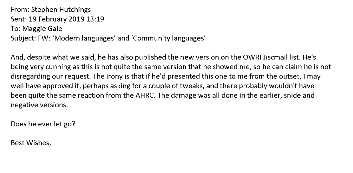 When I expressed a wish to contribute to the OWRI series of policy briefings (controlled by Cambridge-based Wendy Ayres-Bennett and Belfast-based Janice Carruthers, both professors of French) Hutchings sabotaged that effort by writing to Carruthers to advise that working with me would be a way of “dispelling his paranoid delusions about you” while at the same time advising: “he is going through a particularly unpleasant and disruptive phase at the moment and is proving something of a nightmare to deal with. This doesn’t mean to say he wouldn’t behave in the context of a policy briefing (he is, believe it or not, quite capable of this, from time to time!) but I would be deceiving you if I said there wasn’t a risk. Or you could just not reply and hope he forgets.” From her side, Carruthers (at the time also responsible for Modern Languages on behalf of the AHRC) not only declined to accommodate a policy briefing on city multilingualism but also blocked the use of OWRI communication support for our campaign to amend the Census question on language. I was advised that “we shouldn’t antagonise civil servants” and that the best approach was a behind the scenes advance by Cambridge staff to Cambridge graduates. These British-born colleagues whose interest was limited to European languages not only shied away from embracing a broader and more inclusive linguistic agenda, they also claimed sole and exclusive ownership over the public engagement space around languages and the access to policymakers.